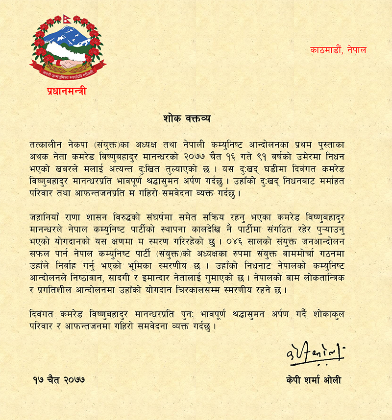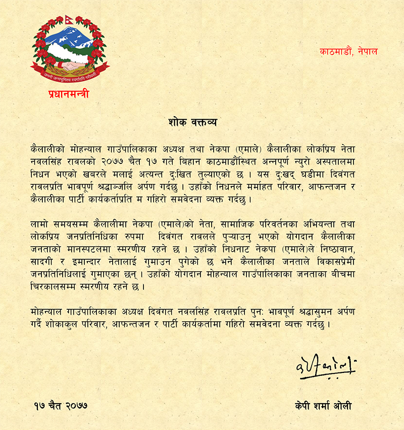 प्रधानमन्त्रीद्वारा मानन्धर र रावलको निधनप्रति शोक व्यक्त