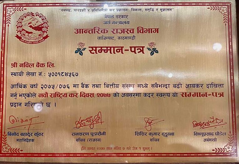 विभागले गत मंसिरमा कर दिवसको अवसर पारेर बैंकलाई बैंकहरु मध्ये सबैभन्दा बढि कर्पाेरेट ट्याक्स जम्मा गर्ने सुचीमा नबिल बैंकलाई राखेको थियो । मंसिरमा कोभिडको भय र तिहारको समय भएकाले औपचारिक कार्यक्रम भने भएको थिएन । पछिल्लो १० वर्षमा नबिल बैक उच्च कर भुक्तानी गर्नेमा यो पा“चौ पटक हो । समृद्ध मुलुक निर्माणका लागि बैंकले आफ्नो तर्फबाट सरकारलाई योगदान पु¥याएकोमा गर्व महसुस गरेको जनाएको छ । बैंकले व्यापार प्रबर्धन, रोजगारी सिर्जना र ट्याक्सको रुपमा राज्यको योगदानमा केन्द्रित रहेको छ ।