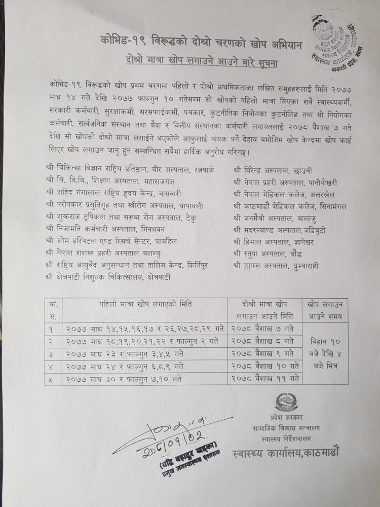 काठमाडौं । कोरोना भाइरस (कोभिड-१९) विरुद्धको खोपको दोस्रो डोज लगाउने तालिका फेरिएको छ । अब कोरोना भाइरसविरुद्धको पहिलो डोज खोप लगाएकाहरुले यही ७ देखि ११ गतेसम्म दोस्रो डोज खोप लगाउन पाउने भएका छन्।
