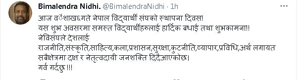 काठमाडौं । नेपाली कांग्रेसका उपसभापति बिमलेन्द्र नीधिले विद्यार्थी संघको स्थापना दिवसको अवसरमा शुभकामना व्यक्त गरेका छन् ।