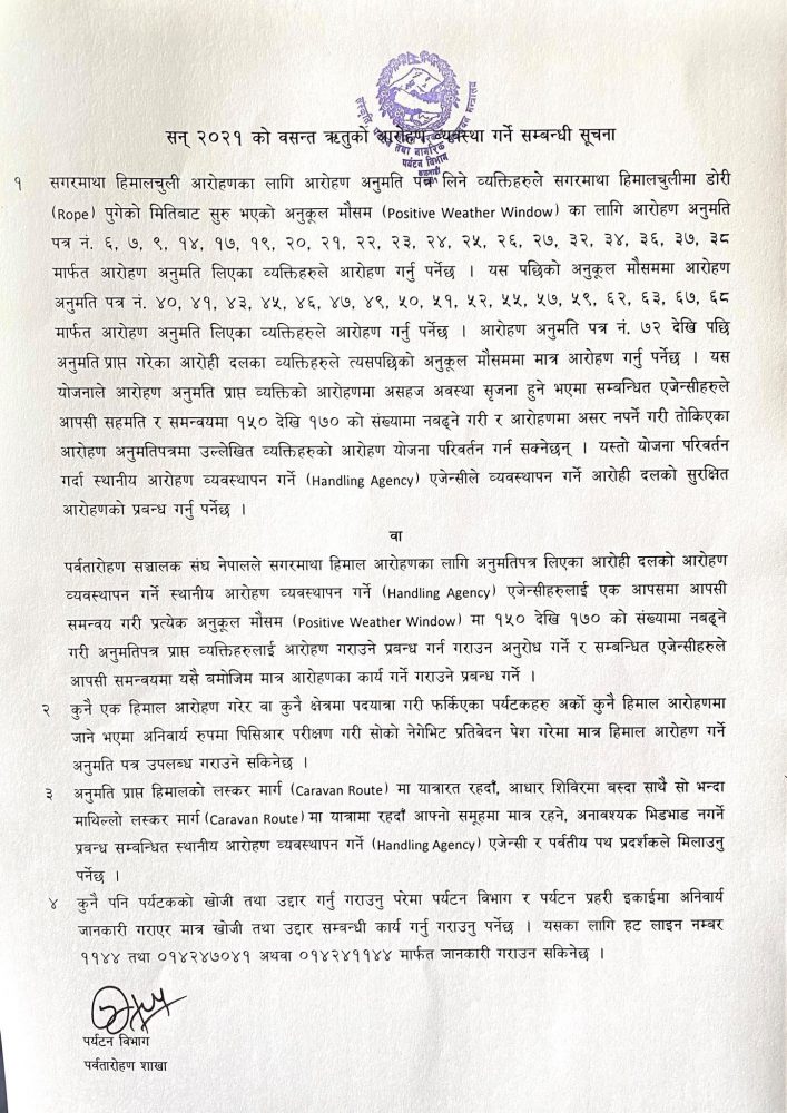 यस वर्षको वसन्त ऋतुमा सगरमाथा आरोहणका लागि ४२ समूहका तीन सय ९४ जनाले अनुमति लिएका पर्यटन विभागकी निर्देशक मीरा आचार्यले जानकारी दिए । अनुमति लिनेमध्ये ९० जना महिला छन् । यस अघि सन् २०१९ मा तीन सय ८१ जनाले सगरमाथा आरोहणका लागि अनुमति लिएका थिए ।