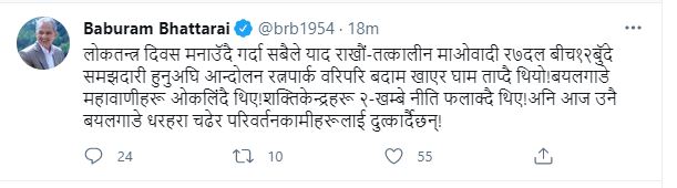 ‘लोकतन्त्र दिवस मनाउँदै गर्दा सबैले याद राखौं-तत्कालीन माओवादी र ७दलबीच १२ बुँदे समझदारी हुनुअघि आन्दोलन रत्नपार्क वरिपरि बदाम खाएर घाम ताप्दै थियो ! बयलगाडे महावाणीहरू ओकलिंदै थिए ! शक्तिकेन्द्रहरू २-खम्बे नीति फलाक्दै थिए ! अनि आज उनै बयलगाडे धरहरा चढेर परिवर्तनकामीहरूलाई दुत्कार्दैछन् ! ’