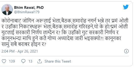 सामाजिक सञ्जालमा एक ट्वीट गर्दै रावलले प्रश्न गरेका छन् प्रम ओली र उनका निकटस्थहरू भेला, बैठक,समारोह गरिरहने, यो के हो ? उनले थपेका छन् प्रम ओली गुटलाई सरकारी निर्णय लाग्दैन र ?