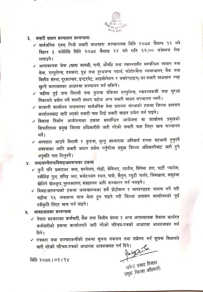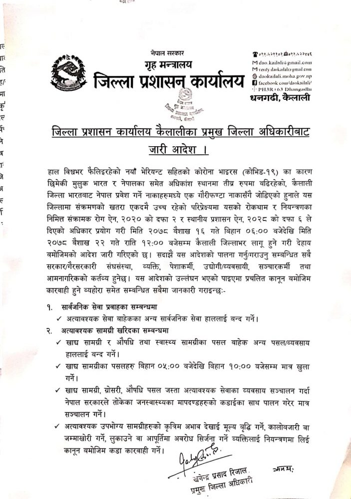 कैलालीका प्रमुख जिल्ला अधिकारी खगेन्द्रप्रसाद रिजालले १६ गते बिहान ६ बजेदेखि २२ गते राति १२ बजेसम्म निषेधाज्ञा जारी भएको जानकारी दिए । अहिलेको कोरोनाको चेन ब्रेक गर्न पनि निषेधाज्ञा गर्नुपर्ने बाध्यता देखियो । यो अवधिमा अत्यावश्यक सेवाबाहेक सबै बन्द रहनेछन्’, प्रमुख जिल्ला अधिकारी रिजालले भने। आवश्यक परे निषेधाज्ञाको अवधि थप्न सकिने उनको भनाइ छ ।