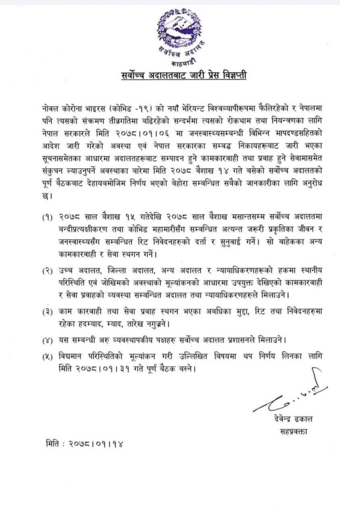 अदालतका सह–प्रवक्ता देवेन्द्र ढकालले एक विज्ञप्ति निकालेर अदालतमा बन्दी प्रत्यक्षीकरण तथा कोरोना महामारीसँग सम्बन्धित अत्यन्त जरुरी प्रकृतिका जीवन र जनस्वास्थ्यसँग सम्बन्धित रिट निवेदनको दर्ता र सुनुवाइबाहेकका अन्य काम र सेवा स्थगन गरिएको बताए ।