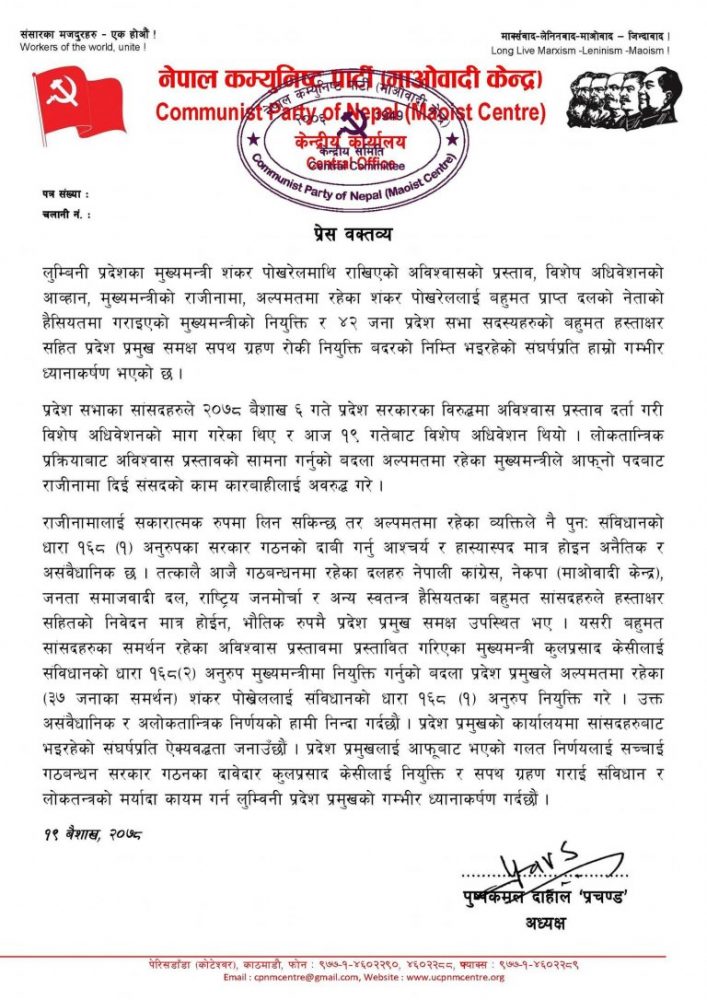 काठमाडौं । नेकपा माओवादी केन्द्रका अध्यक्ष पुष्पकमल दाहाल प्रचण्डले लुम्बिनी प्रदेशमा अल्पमतमा परेका शंकर पोखरेललाई मुख्यमन्त्रीमा नियुक्ति गरिएको घटनाको भर्त्सना गर्दै निर्णय सच्याउन माग गरेका छन् ।