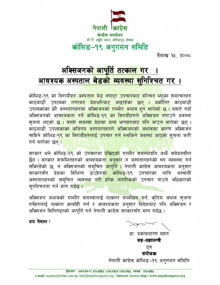 नेपाली कांग्रेस कोभिड-१९ अनुगमन समितिका संयोजक प्रकाशशरण महत शनिबार विज्ञप्ति जारी गरेर अक्सिजन अभावको गम्भीर समस्यालाई तत्काल सम्बोधन गर्न, कृतिम अभाव सृजना गर्नेहरुलाई तत्काल काबारही गर्न र आवश्यकताअनुसार विदेशबाट पनि अक्सिजन र अक्सिजन सिलिन्डरको आपूर्ति गर्न सरकारसँग माग गरेका हुन् ।