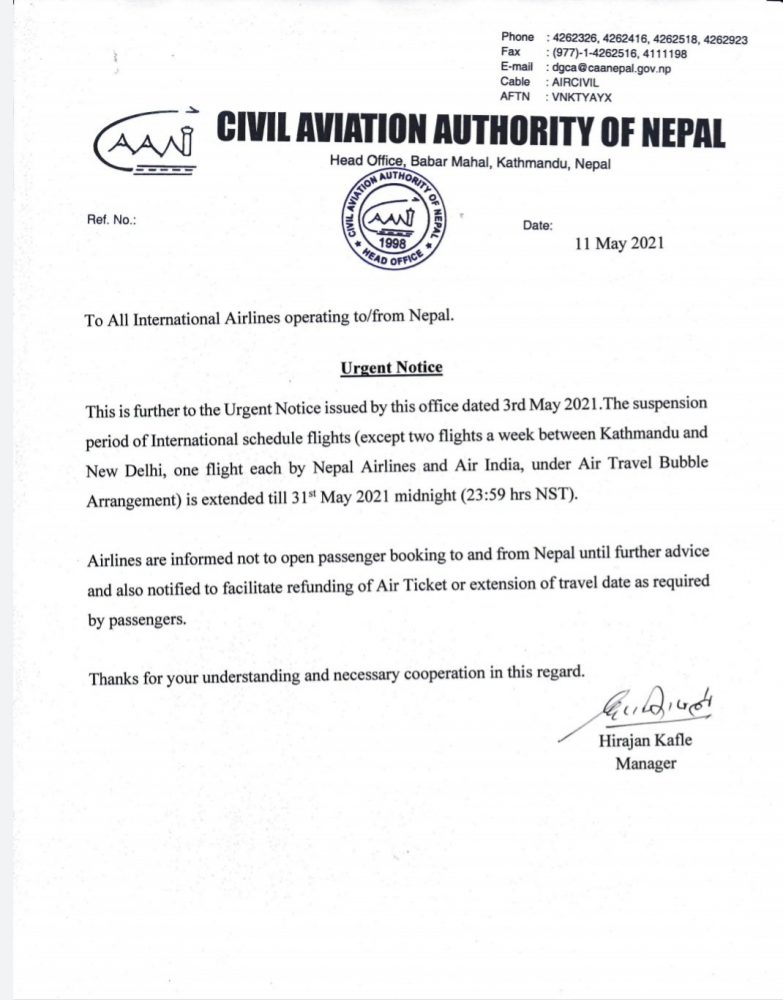 भारतसँग हप्तामा दुई उडान भने यथावत् नै रहने सूचनामा बताइएको छ । कोरोना भाइरसको महामारी नियन्त्रण गर्न सरकारले वैशाख मसान्तसम्म उडानमाथि प्रतिबन्ध लगाउने निर्णय गरेकोमा सङ्क्रमण बढ्दै गएपछि यसलाई लम्ब्याएर जेठ १७ सम्म पुर्याइएको हो ।