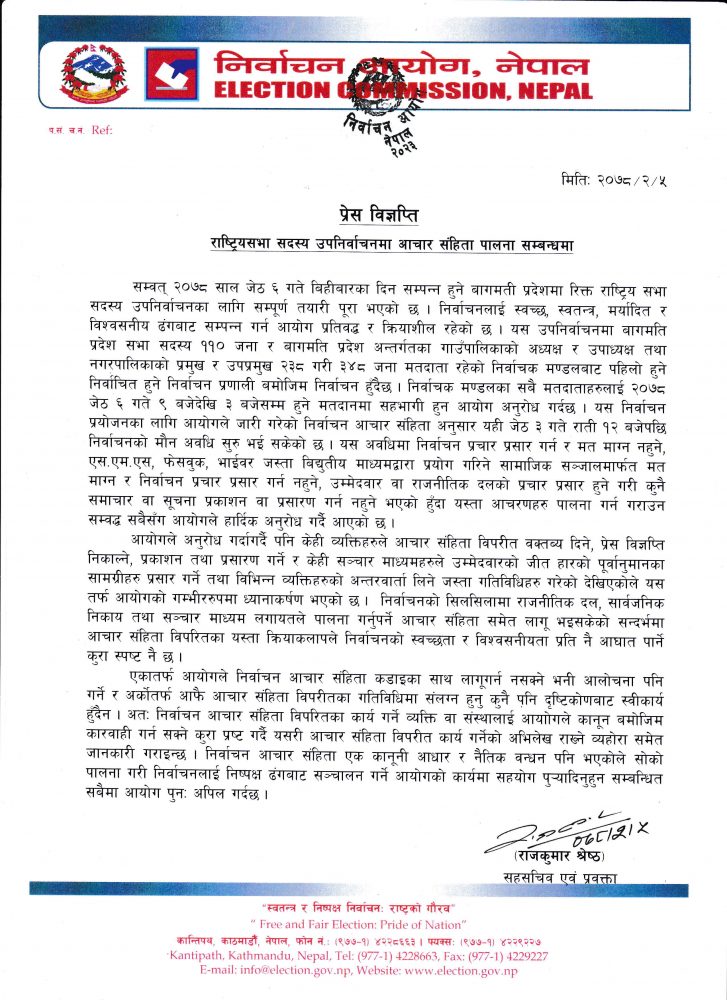 ‘निर्वाचनको सिलसिलामा राजनीतिक दल, सार्वजनिक निकाय तथा सञ्चारमाध्यमलगायतले पालना गर्नुपर्ने आचारसंहितासमेत लागू भइसकेको सन्दर्भमा आचारसंहिता विपरीतका यस्ता क्रियाकलापले निर्वाचनको स्वच्छता र विश्वसनीयताप्रति नै आघात पार्ने कुरा स्पष्ट नै छ’, आयोगले विज्ञप्तिमा भनेको छ ।