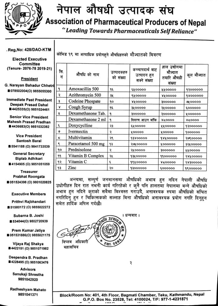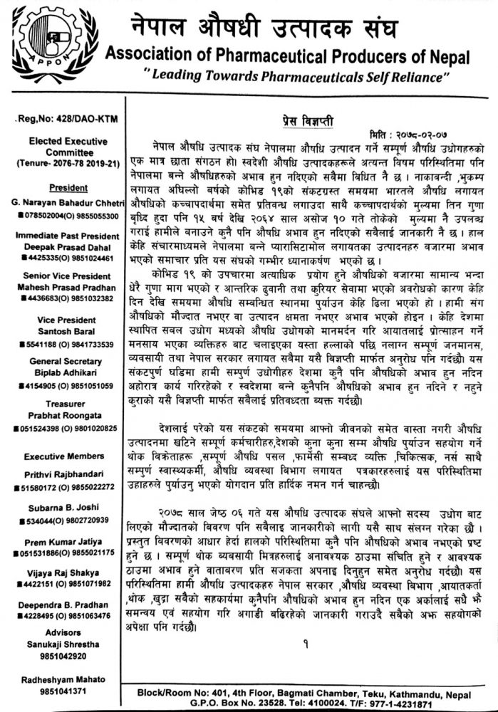 बिहीबारसम्मको विज्ञप्ति जारी गर्दै मौज्दात हेर्दा कुनै पनि औषधिको अभाव नभएको भन्दै अनावश्यक खरिद र भण्डारण नगर्न विक्रेता तथा उपभोक्ताहरूलाई संघले आग्रह गरेको छ ।