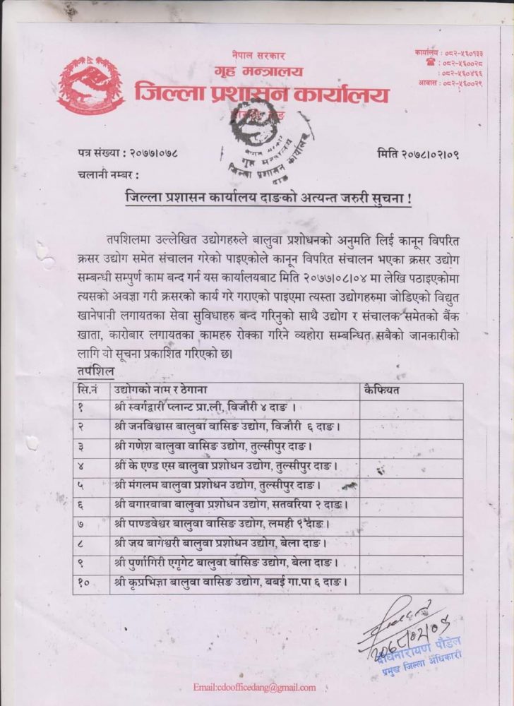 साथै उद्योग र सञ्चालकसमेतको बैंक खाता, कारोबारलगायतका काम रोक्का गरिने दाङका प्रमुख जिल्ला अधिकारी दीर्घनारायण पौडेलले सूचनामार्फत चेतावनी दिए ।