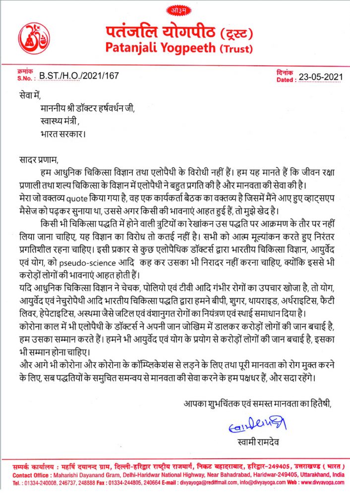 स्वास्थ्यमन्त्रीले पठाएको पत्रमा कोरोना महामारीविरुद्ध लडिरहेका योद्धाहरूको अपमान गर्दै रामदेवले देशको भावनामा गहिरो ठेस पुर्याएकोले आपत्तिजनक वक्तव्य फिर्ता लिन लेखिएको थियो।