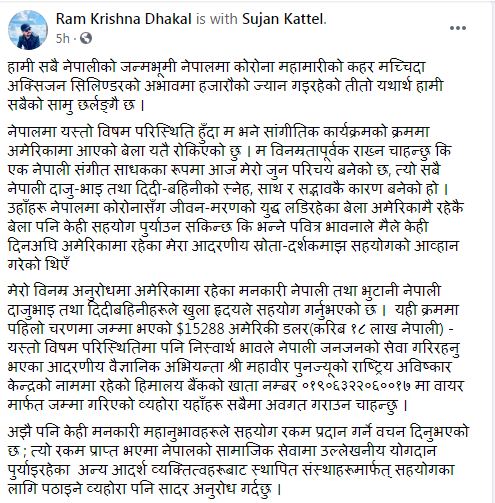 ‘म विनम्रतापूर्वक राख्न चाहन्छु कि एक नेपाली संगीत साधकका रूपमा आज मेरो जुन परिचय बनेको छ, त्यो सबै नेपाली दाजुभाइ तथा दिदीबहिनीको स्नेह, साथ र सद्भावकै कारण बनेको हो । उहाँहरू नेपालमा कोरोनासँग जीवन–मरणको युद्ध लडिरहेका बेला अमेरिकामै रहेकै बेला पनि केही सहयोग पुर्याउन सकिन्छ कि भन्ने पवित्र भावनाले मैले केही दिनअघि अमेरिकामा रहेका मेरा आदरणीय स्रोता–दर्शकमाझ सहयोगको आह्वान गरेको थिएँ’, उनले लेखेका छन् ।