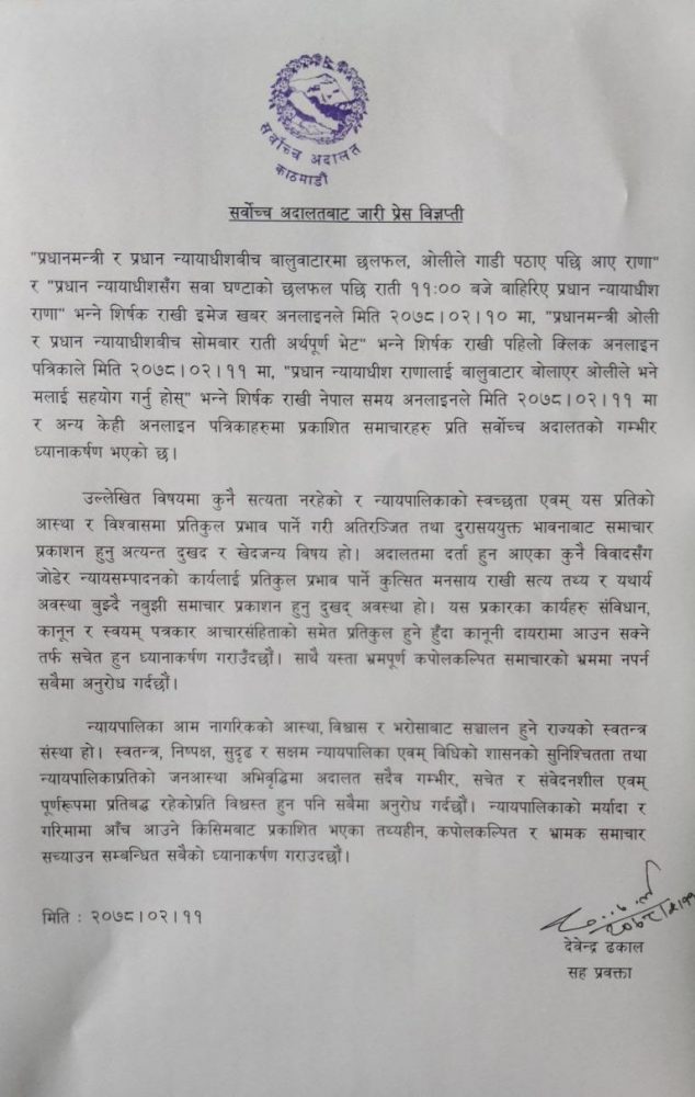सर्वोच्चका सह–प्रवक्ता देवेन्द्र ढकालले जारी गरेको विज्ञप्तिमा प्रधानमन्त्री र प्रधानन्यायाधीशबीच बालुवाटारमा मध्यरातमा छलफल भएकोलगायतका शिर्षक राखि विभिन्न सञ्चारमाध्यममा प्रकाशित समाचारमा कुनै सत्यता नरहेको उल्लेख गरिएको छ ।
