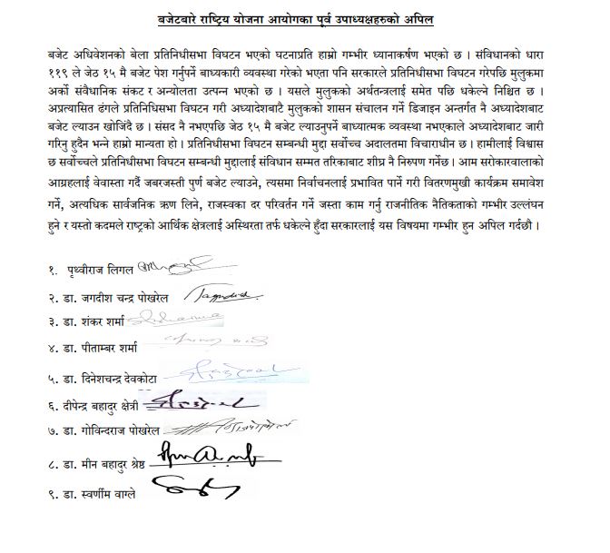 पृथ्वीराज लिगल, डाक्टर जगदीशचन्द्र पोखरेल, डाक्टर शङ्कर शर्मा, डाक्टर पीताम्बर शर्मा, डाक्टर दिनेशचन्द्र देवकोटा, डाक्टर गोविन्दराज पोख्रेल, डाक्टर मीनबहादुर श्रेष्ठ, डाक्टर स्वर्णिम वाग्ले र दीपेन्द्रबहादुर क्षेत्रीले संयुक्त विज्ञप्ति निकालेर प्रतिनिधि सभा नै नरहेको अवस्थामा जेठ १५ गते बजेट ल्याउने संवैधानिक व्यवस्था नरहेको भन्दै यसलाई रोक्न माग गरेका छन् ।