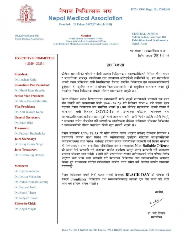स्वास्थ्यकर्मीमाथि हातपात गर्नेलाई कडा कारबाही गर्न चिकित्सक संघकाे माग