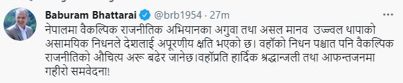 भावपूर्ण श्रद्धाञ्जली! विवेकशील नेपाली दलका संस्थापक अध्यक्ष उज्जवल थापाको असामयिक निधनको खबरले अत्यन्तै दुखी छु। स्वर्गीय थापाको आत्माको चीर शान्तिको कामनासहित भावपूर्ण श्रद्धाञ्जली व्यक्त गर्दै शोकाकुल परिवारजनमा हार्दिक समवेदना व्यक्त गर्दछु।