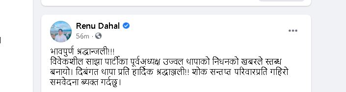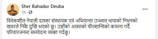 विवेकशील साझा पार्टीका संस्थापक अध्यक्ष उज्जवल थापाको दुःखद निधनको खबरले अत्यन्तै मर्माहत बनाएको छ । शोकको यस घडिमा स्व. थापाको आत्माको चिर शान्तिको कामना गर्दै शोकाकुल परिवारजनमा गहिरो समवेदना व्यक्त गर्दछु !