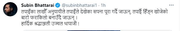 फरक सोंच र अभ्यासमार्फत छोटो समयमै नेपाली राजनीतिमा प्रभाव छोड्न सफल विवेकशील साझा पार्टीका पूर्वअध्यक्ष एवं मेरा मित्र उज्ज्वल थापाको अकल्पनीय निधनले म अत्यन्त दुखित छु । देशले संभावना बोकेका एक असल युवा नेतालाई अल्पायुमै गुमाउनु परेको छ । यो दु:खद क्षणमा दिवंगत उहाँप्रति हार्दिक श्रद्धाञ्जली अर्पण गर्दै शोक संतप्त सबैमा हार्दिक समवेदना व्यक्त गर्दछु ।