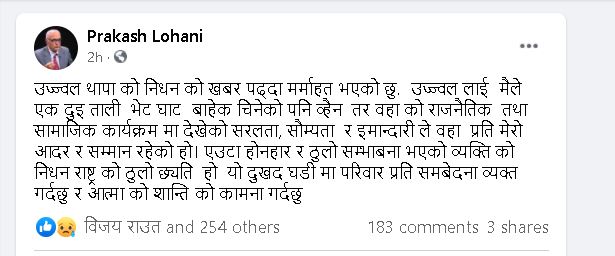 उज्ज्वल थापा को निधन को खबर पढ्दा मर्माहत भएको छु । उज्ज्वल लाई मैले एक दुइ ताली भेट घाट बाहेक चिनेको पनि व्हैन तर वहा को राजनैतिक तथा सामाजिक कार्यक्रम मा देखेको सरलता, सौम्यता र इमान्दारी ले वहा प्रति मेरो आदर र सम्मान रहेको हो। एउटा होनहार र ठुलो सम्भाबना भएको व्यक्ति को निधन राष्ट्र को ठुलो छ्यति हो यो दुखद घडी मा परिवार प्रति समबेदना व्यक्त गर्दछु र आत्मा को शान्ति को कामना गर्दछु ।