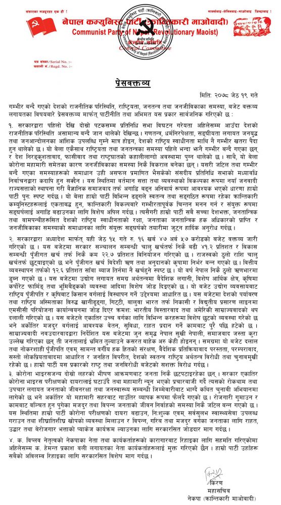 बुधबार नेपाल कम्युनिस्ट पार्टी क्रान्तिकारी माओवादीका महासचिव मोहन वैद्य ‘किरण’ द्वारा जारी विज्ञप्तिमा राष्ट्रियता तथा जनतन्त्रका समस्या पहिले भन्दा झनै गम्भीर बन्दै गएको, देश निरङ्कुशतावाद, फासीवाद तथा राष्ट्रघातको कहालीलाग्दो अवस्थामा पुग्न थालेको र कोरोना महामारीसमेतका कारण जनजीविकाका समस्या निकै विकराल बनेको समयमा मध्यावधि निर्वाचनले समस्याको समाधान हुनै नसक्ने जनाएको छ । पार्टीले यस्तो स्थितिमा वर्तमान सत्ता तथा व्यवस्थाको विकल्पका रूपमा नयाँ जनवादी राज्य सत्ताको स्थापना गरी वैज्ञानिक समाजवाद तर्फ अगाडि बढ्न अनिवार्य रूपमा आवश्यक भएको धारणा राखेको छ ।