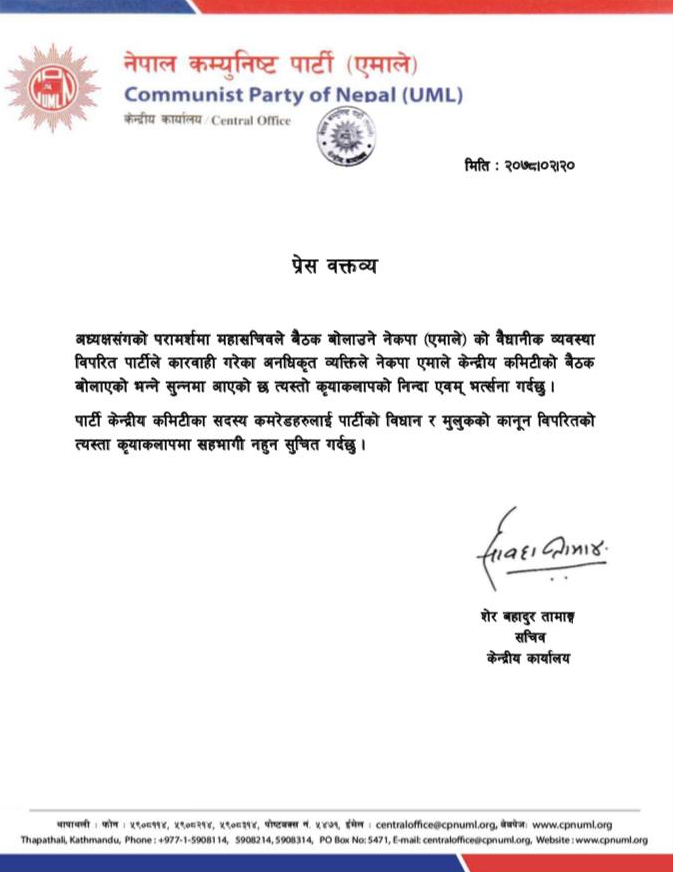 ‘अध्यक्षसँगको परामर्शमा महासचिवले बैठक बोलाउने पार्टीको वैधानिक व्यवस्था रहेकामा पार्टीले कारबाही गरेका केही अनधिकृत व्यक्तिहरुले नेकपा एमालेको केन्द्रीय कमिटीको बैठक बोलाएको भन्ने सूचना आएको छ, त्यस्ता क्रियाकलापको निन्दा र भर्त्सना गर्दछु,’ विज्ञप्तिमा भनिएको छ ।
