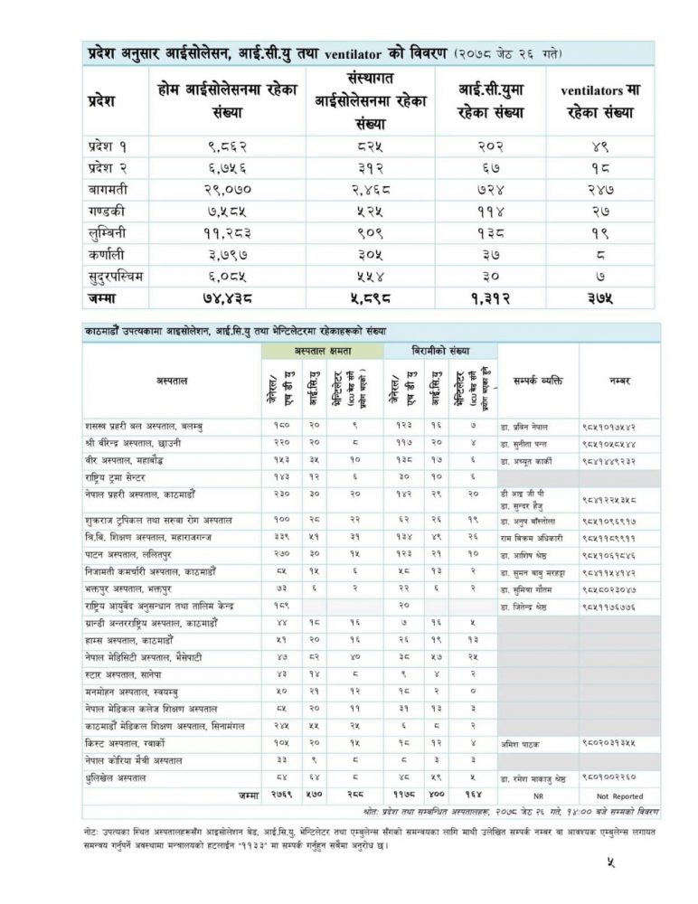 हाल प्रदेश १ मा २०२ जना आईसीयूमा र ४९ भेन्टिलेटरमा, प्रदेश २ मा ६७ आईसीयूमा र १८ जनाको भेन्टिलेटरमा, वाग्मती प्रदेशमा ७२४ जना आईसीयूमा र २४७ जना भेन्टिलेटरमा, गण्डकी प्रदेशमा ११४ जना आईसीयूमा र २७ जना भेन्टिलेटरमा, लुम्बिनी प्रदेशमा १३८ जना आईसीयूमा र १९ जना भेन्टिलेटरमा, कर्णालीमा ३७ जना आईसीयूमा र ८ जना भेन्टिलेटरमा, सुदूरपश्चिम प्रदेशमा ३० जना आईसीयू र ७ जनाको भेन्टिलेटरमा उपचार भइरहेको छ ।