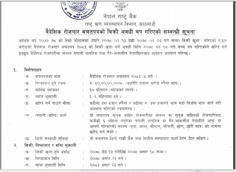 राष्ट्र बैंकले यसअघि जेठ १३ गतेबाट ऋण व्यवस्थापन विभागअन्तर्गत वैदेशिक रोजगार बचतपत्र २०८३ (पाँच वर्षे) को बिक्री खुल्ला गरेको थियो । पुर्वनिधारिकत कार्य तालिका अनुसार निष्काशन मिति २०७८ असार ८ गते तोकिएको बचतपत्रको सावाँ भुक्तानी मिति भने २०८३ असार ८ गते तोकिएको थियो ।