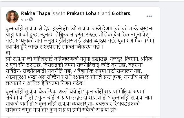 उनले लेखेकि छन् – कुन चाँही राप्रपा बैकल्पिक शक्ती बन्ने हो ? कुन चाँही राप्रपा मौलिकरुपमा सबैको पार्टी हो ? कुन चाँही राप्रपा उदाउदो राप्रपा हो ? कुन चाँही राप्रपा नाम मात्रको पार्टी हो ? कुन चाँही राप्रपा व्यबहारमा बयस्क र रिटायर्डहरुको सरोकार समुह मात्र हो ? कुन राप्रपा हामी सबैको राप्रपा हो ?