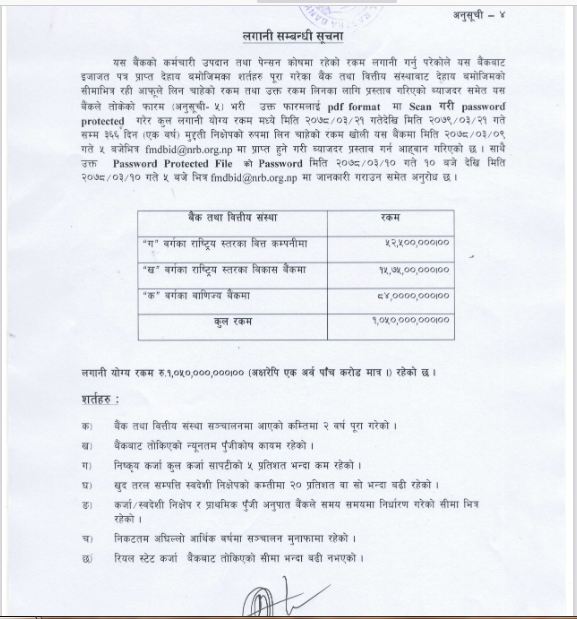 यसरी मुुद्धती निक्षेपकोरुपमा राखिने कुुल रकम मध्येमा वाणिज्य बैंकहरुको लागि ८४ करोड, विकास बैंकहरुको लागि १५ करोड ७५ लाख र फाइनान्स कम्पनीहरुको लागि पाँच करोड २५ लाख रुपैयाँ रहेको छ ।