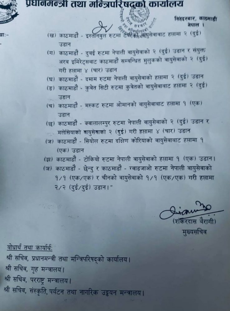 कोटा तोकेर सर्तसहित हवाई उडान खुला गर्ने सरकारको निर्णय