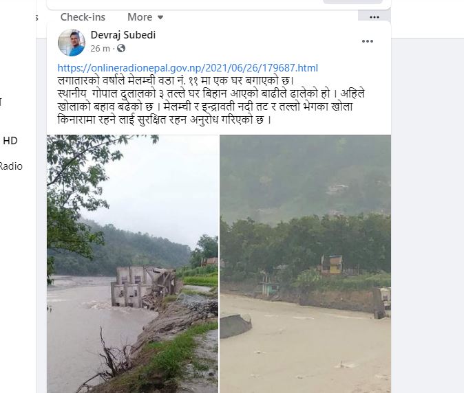 स्थानीय गोपाल दुलालको ३ तल्ले घर शनिबार बिहान आएको बाढीले ढालेको पत्रकार देबराज सुवेदीले आफ्नो फेसबुक मार्फत जानकारी गराएका छन् । उक्त क्षेत्रमा अहिले पनि लगातार वर्षा भइरहेको छ । निरन्तरको वर्षाका कारण खोलाको बहाब बढेको छ । मेलम्ची र इन्द्रावती नदी तट र तल्लो भेगका खोला किनारामा रहने लाई सुरक्षीत रहन अनुरोध गरिएको छ।