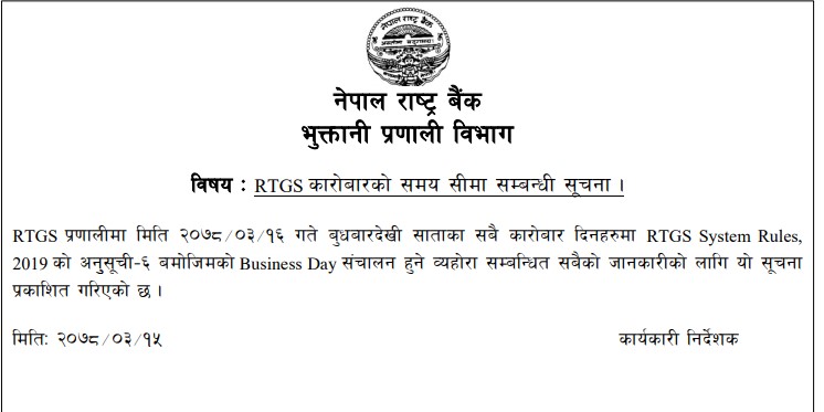 राष्ट्र बैंकले नेपाल सरकारको विद्युतीय कोष हस्तान्तरण कारोबार फट्र्यौटका लागि असार १६ गतेदेखि आरटिजीएस सिस्टम रुल्स २०१९ को अनुसूची ६ बमोजिमको ‘बिजनेस डे’ सञ्चालन गर्न बैंक तथा वित्तीय संस्थालाई निर्देशन दिएको हो।