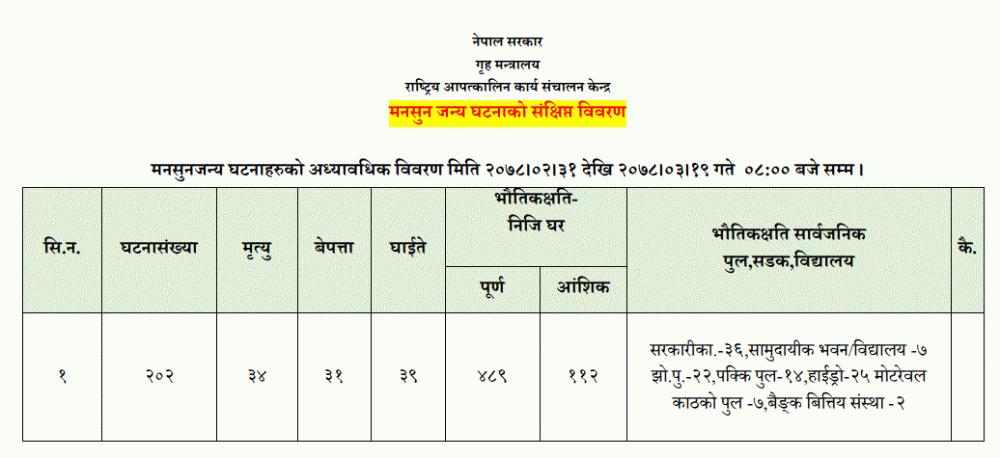 गृह मन्त्रालयअन्तर्गतको राष्ट्रिय आपत्कालीन कार्य सञ्चालन केन्द्रले अद्यावधिक गरेको पछिल्लो विवरणअनुसार आज (शनिबार) बिहानसम्म मनसुनजन्य घटना दुई सय दुईवटा भएका छन् ।