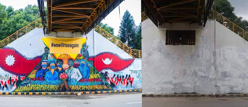 कोरोनाविरुद्धको लडाइँमा अग्रपंक्तिमा रहेर काम गर्ने स्वास्थ्यकर्मी, सुरक्षाकर्मी, पत्रकार, शव व्यवस्थापन गर्ने व्यक्ति, पाइलट र सरसफाईकर्मीको सम्मानका लागि रत्नपार्क स्थित आकाशे पुलको भित्तामा बनाइएको चित्र काठमाडौं महानगरपालिकाले मेटेपछि कलाकारहरुले चित्र कोर्न पाउनुपर्ने माग गर्दे महानगरलाई निवेदन दिएका हुन् ।