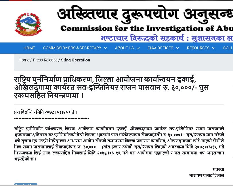 पुनर्निर्माण प्राधिकरणका सब-इन्जिनियर ३० हजार रुपैयाँसहित पक्राउ