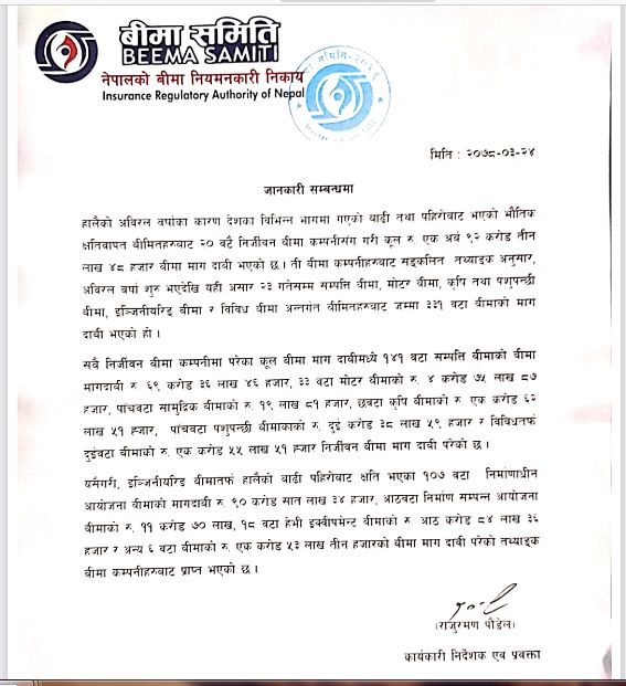 तीन कम्पनीहरुबाट संकलित तथ्यांक अनुसार अविरल बर्षा सुरु भएदेखि यही असार २३ गतेसम्म सम्पती बिमा, मोटर बिमा, कृषि तथा पशुपंक्षी बिमा, इन्जिनियरिङ बिमा र विविध बीमा अन्र्तगत बिमितहरुबाट कुल तीन सय ३१ वटा बिमाको माग दाबी भएको बिमा समितीले जानकारी दिएको छ ।