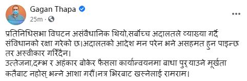 सामाजिक सन्जालमार्फत ‘प्रतिनिधिसभा विघटन असंवैधानिक थियो, सर्वोच्च अदालतले व्याख्या गर्दै संविधानको रक्षा गरेको छ ।’ थापाले भने अदालतको आदेश मन परेन भने असहमत हुन पाइन्छ तर अस्वीकार गरिँदैन ।’