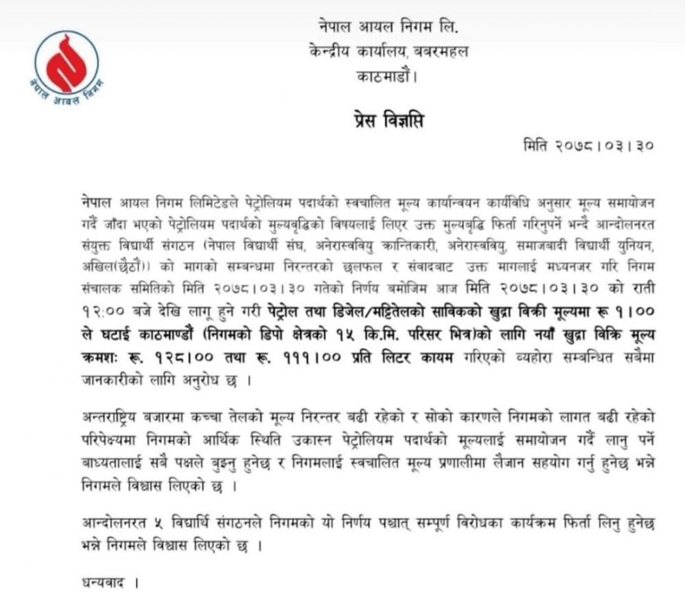 विद्यार्थी संगठनको मागलाई मध्यनजर गर्दै निगमको संचालक समितिको बुधबार बसेको बैठकले आज राति १२ बजेदेखि लागू हुने गरि पेट्रोलियम पदार्थको मूल्य घटाएको विज्ञप्तिमार्फत जनाएको छ ।