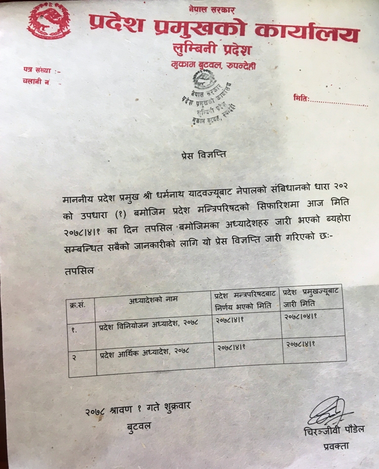 शुक्रबार एक विज्ञप्ति जारी गर्दै संविधानको धारा २०२ को उपधारा १ बमोजिम मन्त्रिपरिषद्को सिफारिसमा अध्यादेश जारी गरिएको प्रवक्ता चिरञ्जीवी पौडेलले उल्लेख गरेका छन् । शुक्रवार बिहान बसेको मन्त्रिपरिषद्को बैठकले अध्यादेशबाट बजेट ल्याउने निर्णय गरेको थियो । अध्यादेशबाट ल्याएको बजेट प्रदेश सभामा प्रस्तुत बजेट नै रहेको प्रवक्ता बैजनाथ चौधरीले जानकारी दिए।