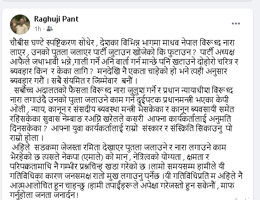 ‘चौबीसघण्टे स्पष्टीकरण सोधेर, देशका विभिन्न भागमा माधव नेपालविरूद्ध नारा लाएर, उनको पुतला जलाएर पार्टी जुटाउन खोजेको कि फुटाउन ? पार्टी अध्यक्ष आफैले जथाभावी भन्ने ,गाली गर्ने अनि वार्ता गर्न मान्छे पनि खटाउने दोहोरो चरित्र र व्यवहार किन र केका लागि ?’ उनले सामाजिक सन्जाल फेटबुकमार्फत भनेका छन्, ‘मनदेखि नै एकता चाहेको हो भने त्यही अनुसार व्यवहार गरौं । सबै संयमित र जिम्मेवार बनौं ।’