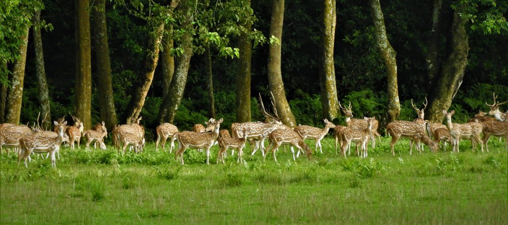 चितवन । सौराहामा रहेको बाघमारा मध्यवर्ती सामुदायिक वनमा रमाउँदै गरेका चित्तल ।