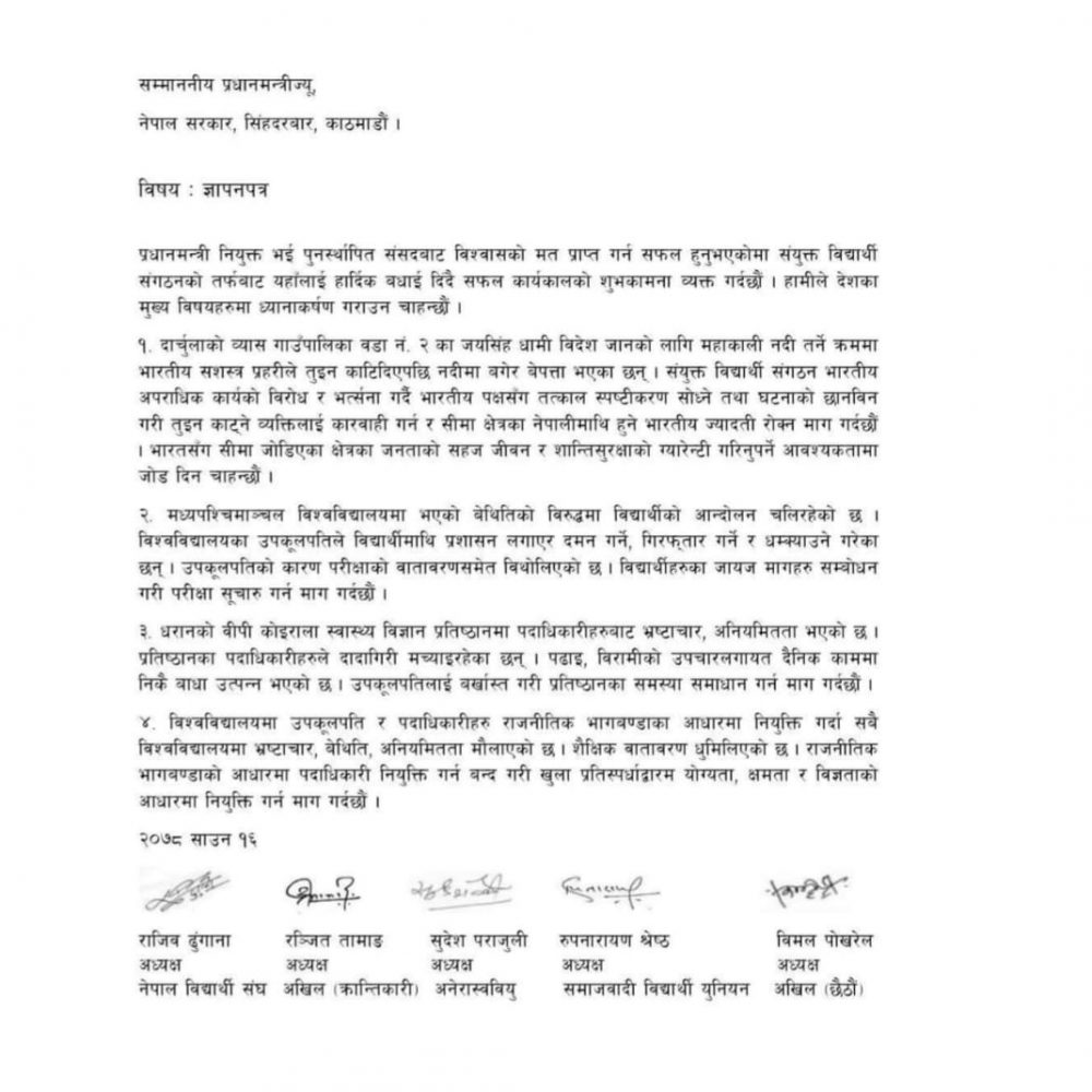 काठमाडौं । महाकाली नदी तर्ने क्रममा भारतीय सशस्त्र प्रहरीले तुइन काटिदिएको सम्बन्धमा भारतीय पक्षसँग तत्काल स्पष्टीकरण सोध्न संयुक्त विद्यार्थी संगठनले प्रधानमन्त्रीसँग माग गरेका छन् ।