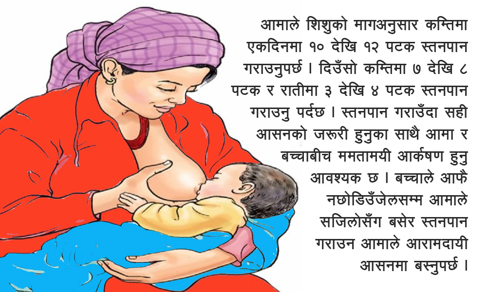 स्तनपान आमा र बच्चा दुवैका लागि अतिआवश्यक हुन्छ । स्तनपानले बच्चा र आमा दुवैको स्वास्थ्य सुधार गर्छ । चिकित्सकका अनुसार बच्चालाई नियमित स्तनपान गराउँदा बच्चा स्वस्थ हुनाका साथै विभिन्न रोगबाट लड्ने क्षमता प्राप्त हुन्छ । स्तनपानको महत्व बुझाउन आइतबारदेखि कैलालीका पालिकाले स्तनपानको महत्व बुझाउन विभिन्न कार्यक्रम पनि गरिरहेका छन् । शिशुलाई सुरक्षित तरिकाले स्तनपान गराउन आमालाई प्रेरित गर्न पालिकाले जनचेतनामूलक कार्यक्रम गरिरहे पनि कामकाजी आमालाई पूर्ण स्तनपान गराउन समस्या छ ।