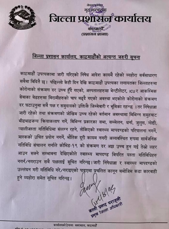 काठमाडौं । जिल्ला प्रशासन कार्यालय काठमाडौंले कुनै पनि प्रकारका सभा, सम्मेलन, सभा र जुलुस गर्न पूर्ण रोक लगाएको छ । मंगलबार प्रमुख जिल्ला अधिकारी कालिप्रसाद पराजुलीले विज्ञप्ति जारी गर्दै पछिल्लो समय भीडभाड हुने क्रियाकलापले कोरोना संक्रमण बढ्दै गएको भन्दै यस्तो कार्य गर्न पूर्ण रोक लगाइएको छ ।