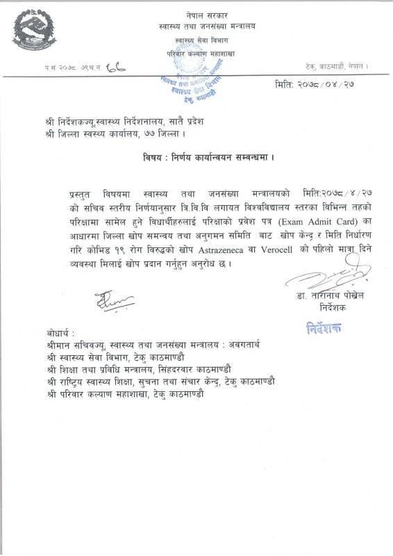 सबै प्रदेश तथा जिल्ला स्वास्थ्य कार्यालयहरूलाई खोपको व्यवस्था गर्न आग्रह गरिएको छ । त्रिविले अहिले स्नातक र स्नातकोत्तर तहको परीक्षा सञ्चालन गरिरहेको छ भने अरू विश्वविद्यालयका पनि परीक्षा सञ्चालन भइरहेका छन् । खोप लगाउने विद्यार्थीले अनिवार्य रूपमा प्रवेश पत्र साथमा लैजानुपर्नेछ ।