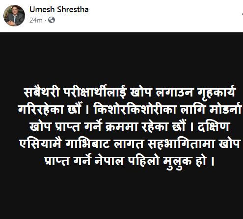 काठमाडौं । स्वास्थ्य राज्यमन्त्री उमेश श्रेष्ठले सबै परीक्षार्थीलाई खोपको व्यवस्था गर्ने गृहकार्य भइरहेको बताएका छन् । सामाजिक सञ्जाल फेसबुकमार्फत उनले सबैथरी परीक्षार्थीलाई खोप लगाउन गृहकार्य गरिरहेको जानकारी दिएका हुन् ।