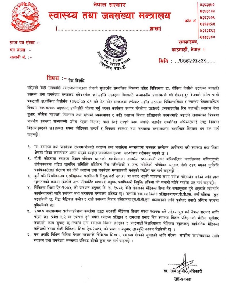 यसअघि विभिन्न समयमा सरकारले चिकित्सा शिक्षा र स्वास्थ्य क्षेत्रको सुधारका लागि गरेका सम्झौता कार्यान्वयनका लागि मन्त्रालय प्रतिबद्ध रहेको पनि विज्ञप्तिमा उल्लेख छ ।