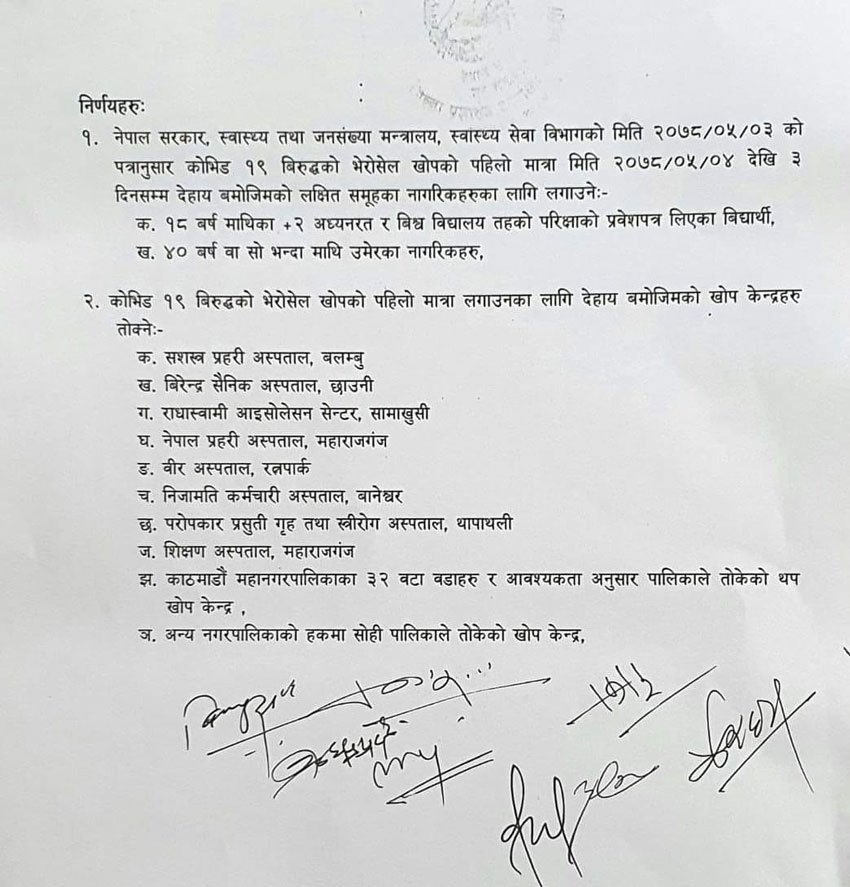 साथै आजैदेखि काठमाडौंमा ४० वर्षमाथिका नागरिकलाई पनि भेरोसेल खोपको पहिलो डोज दिइँदै छ ।