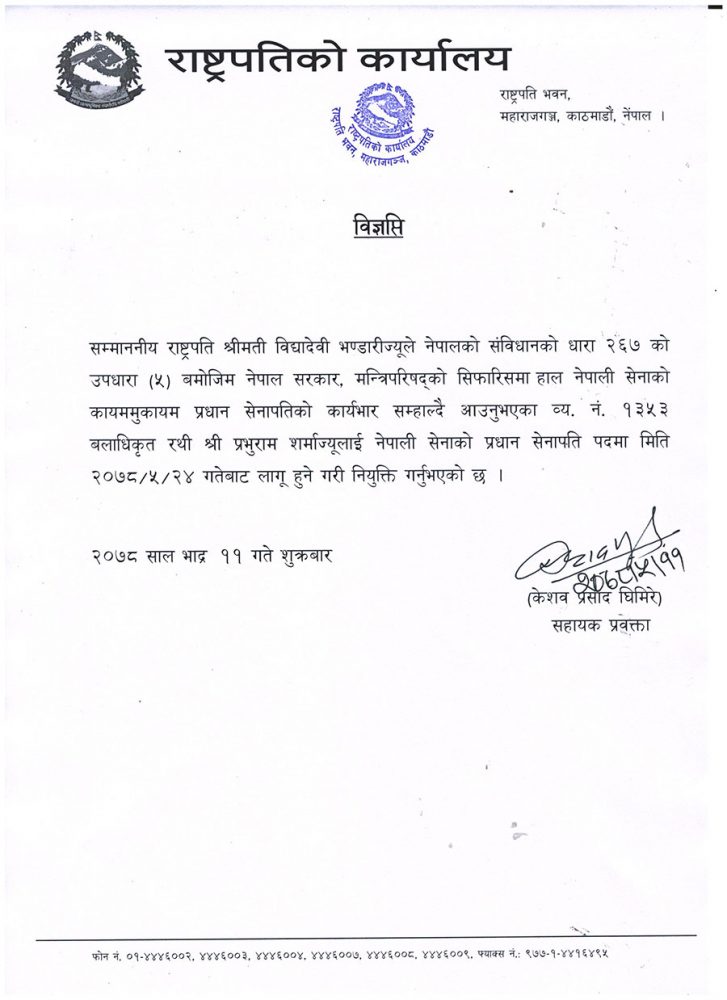 राष्ट्रपति विद्यादेवी भण्डारीले कायममुकायम प्रधानसेनापति प्रभुराम शर्मालाई प्रधानसेनापतिमा नियुक्त गरेकी हुन् ।
